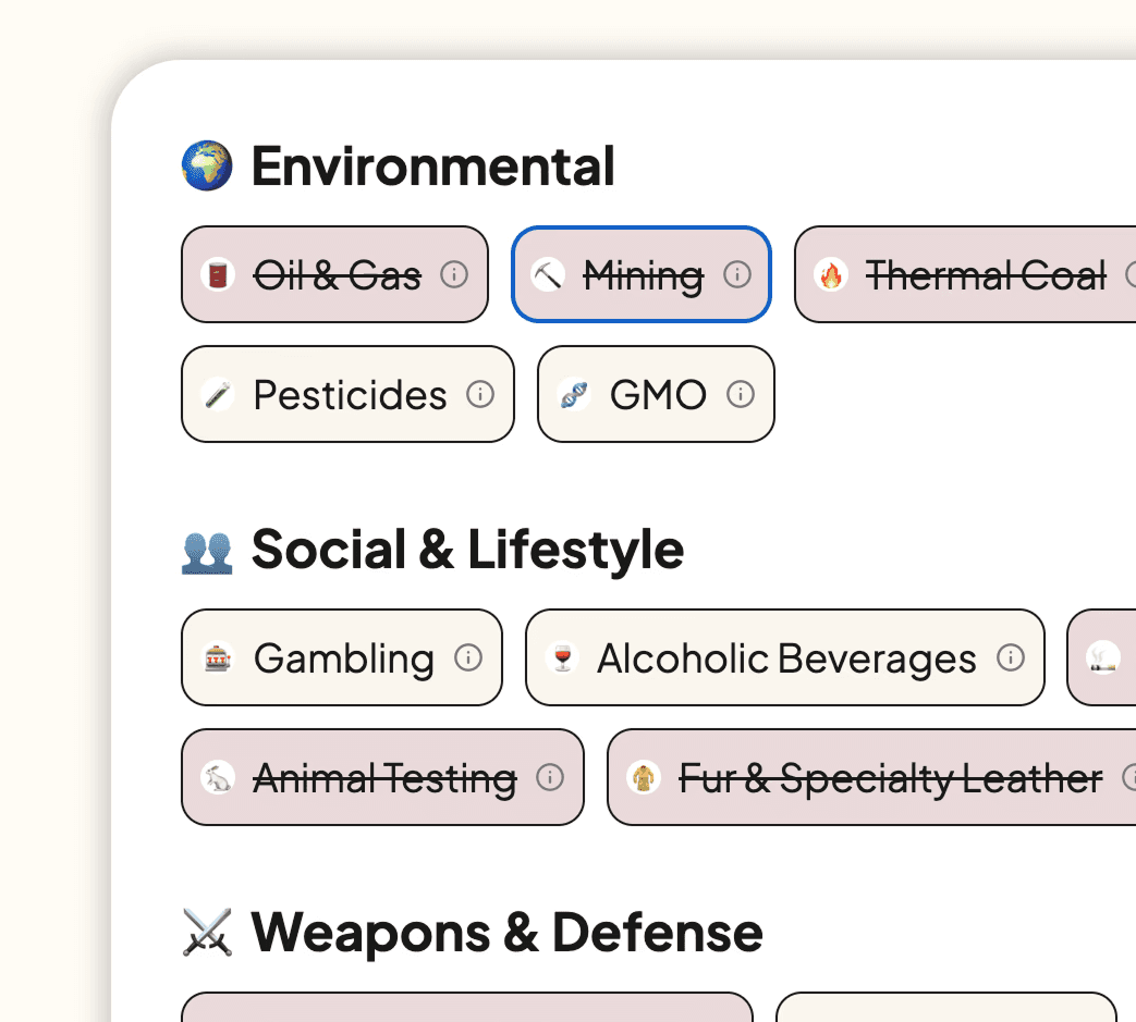 See exactly which companies you’ll be investing in based on negative screening. No vague ESG scores. No surprises.